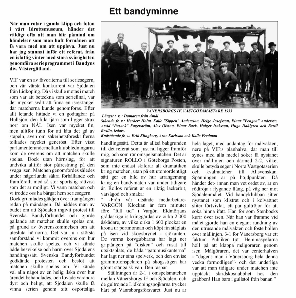 Bandy på Eldmörjan oktober 14, 2025 10:10:13 Larse Larsing Vänersborgs IF seriesegrare. 2000 åskådare! Klipp från vår medlemstidning ”Westgötarnas Idrottshistoria.” Text: Olof Strand. Tidigare WI-tidningar